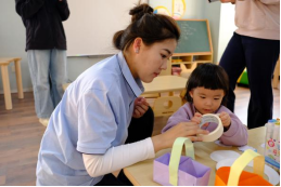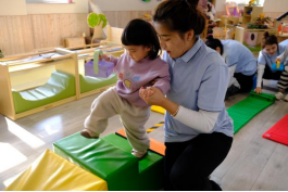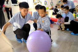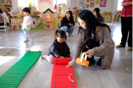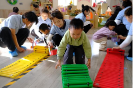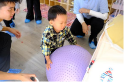 第三关“球进洞,集身体”中,志愿者根据宝宝们年龄差异调整球洞距离,根据宝宝的能力让宝宝推球或踢球进球洞。大家全神贯注,在成功通关后顺利集齐了制作手工小雪人的身体部分的材料,整个过程既锻炼了宝宝们的肢体力量,又培养了他们的专注力与耐力。