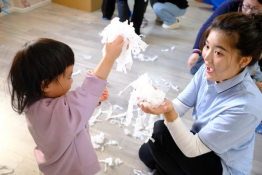活动伊始,“雪花落下来”彩虹伞律动迅速点燃氛围。志愿者以“宝宝们看,天空飘雪花啦!”开启互动,引导宝宝们伸小手模拟飘落,随后引导宝宝们手拉手围伞蹲身,抓伞边共抖“雪花”,伞面起伏如飞雪;待宝宝们呼应想接雪花后,志愿者合力抖伞制造“落雪”场景,叮嘱安全后,宝宝们兴奋伸手接住。笑声与音乐交织,既锻炼了宝宝们的手眼协调能力,也拉近了宝宝与志愿者们之间的距离。