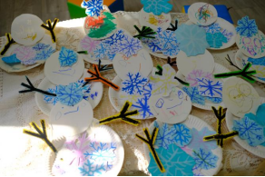 最令人期待的手工制作环节中,宝宝们带着闯关成功的喜悦,迫不及待地投入创作。志愿者们提前准备了大小纸盘、彩色马克笔以及此前手绘的雪花片等材料,结合纸盘手工的特点耐心讲解步骤:先将大小纸盘拼接成小雪人的身体,再用马克笔勾勒五官,最后用雪花片粘贴,装饰小雪人的身体。宝宝们也纷纷拿出自己在闯关活动中收集起来的材料,充分发挥想象力,有的用马克笔给小雪人画了圆眼睛和微笑的嘴巴,有的画出俏皮的弯眉和三角形鼻子,还有的把手绘雪花片错落地贴在纸盘上,当作小雪人的“雪花披风”。志愿者们穿梭其间,手把手指导动手能力较弱的宝宝拼接纸盘、勾勒线条,及时提供协助,家长们也在一旁参与互动,亲子合力装饰作品的画面格外温馨。当一个个形态各异、憨态可掬的纸盘小雪人制作完成,宝宝们高高举起自己的作品,脸上洋溢着自豪与幸福的笑容。