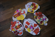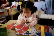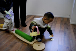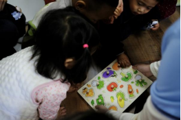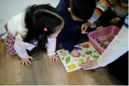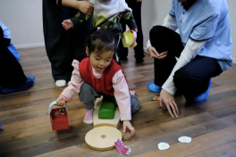 在食材认知环节,志愿团准备了趣味食物嵌板拼图。志愿者先拿出食材向宝宝们发起提问:“今天要吃火锅,这个红红的、圆圆的滑嫩食材是什么?”在宝宝们认出西红柿、南瓜后,志愿者便邀请大家帮“迷路”的食物卡片通过嵌板拼图找到对应位置。在引导下,宝宝们顺利完成了青菜、萝卜等蔬菜及各类肉主食的拼图匹配,不仅认识了食材的名称与特性,还锻炼了观察力和手部精细动作,实现了认知能力的提升。