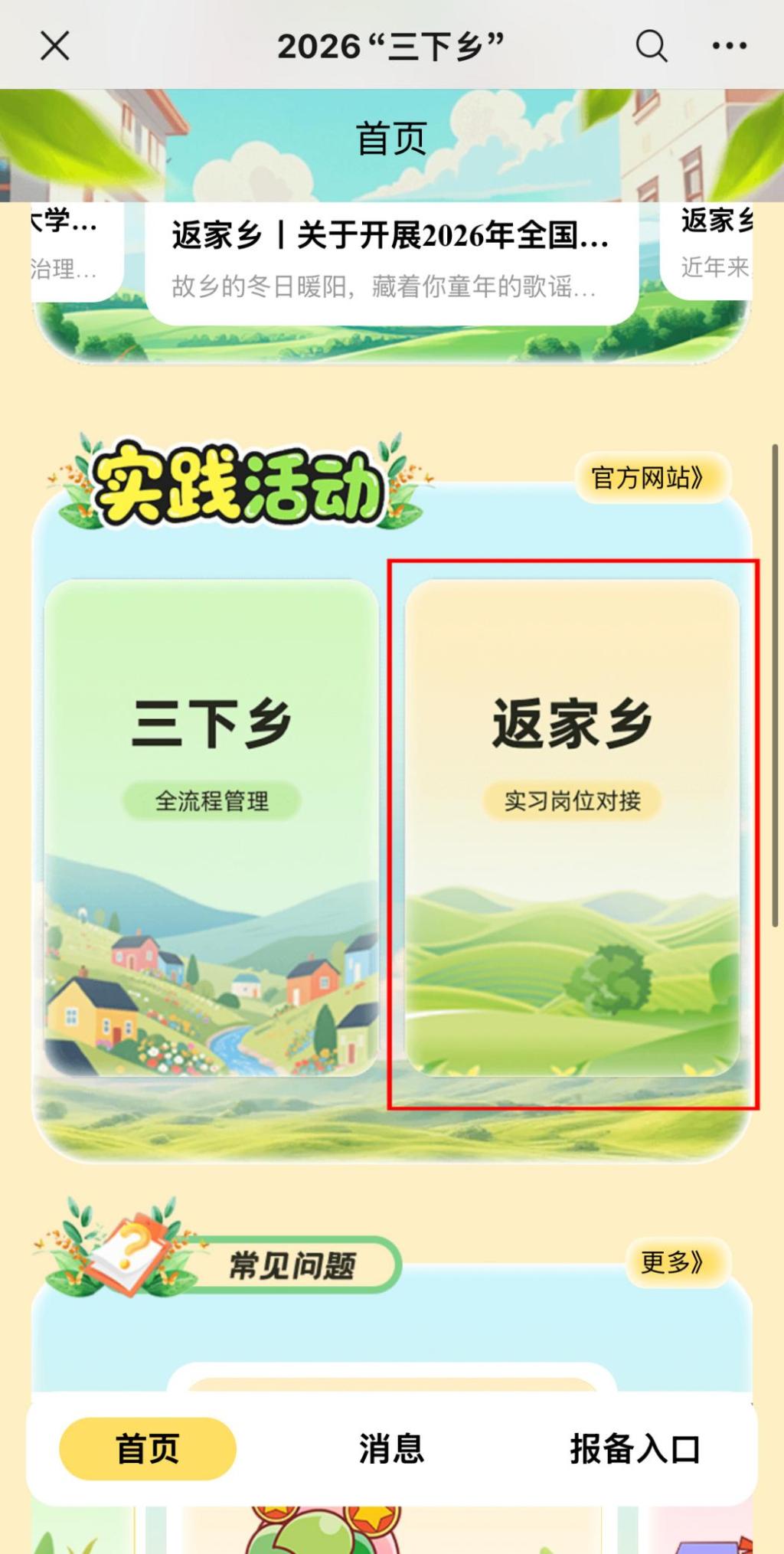 1.关注“创青春”微信公众号,选择“社会实践” - “三下乡” - “返家乡”。首次登陆用户需按提示注册账号并返回登录,已注册的学生或有高校第二课堂成绩单系统账号的学生可直接登录。