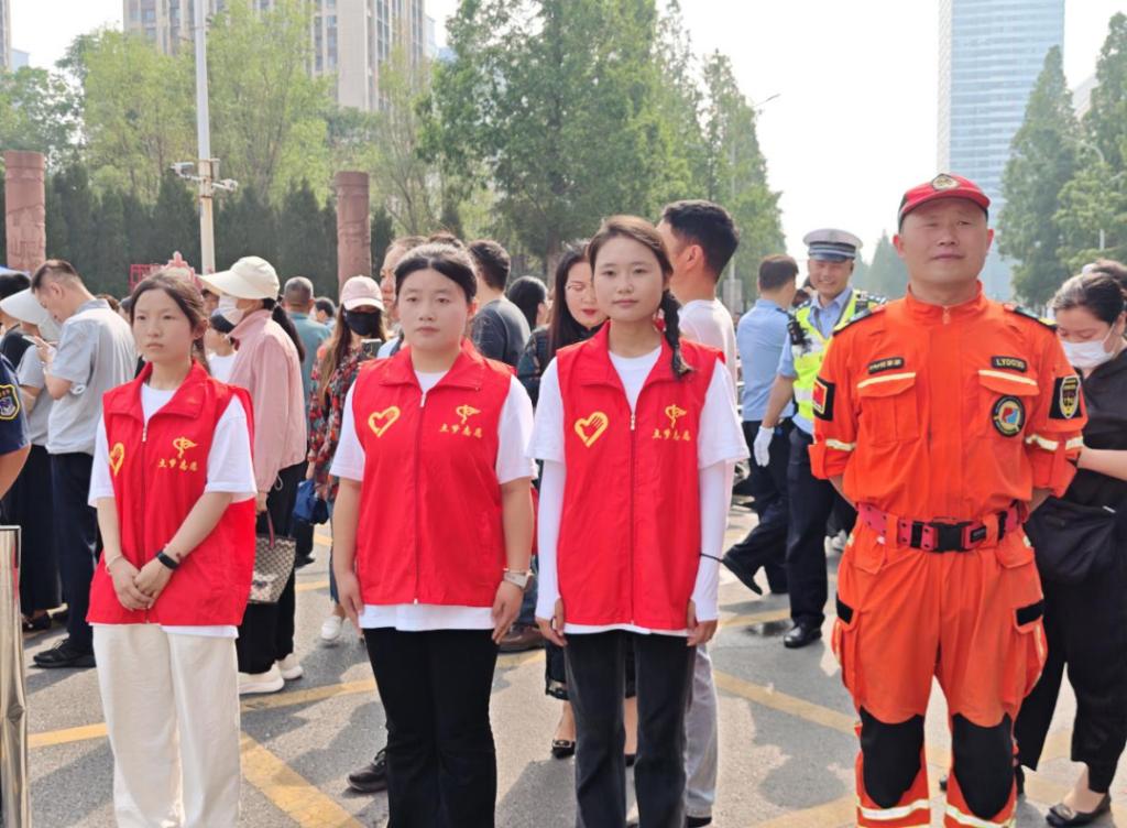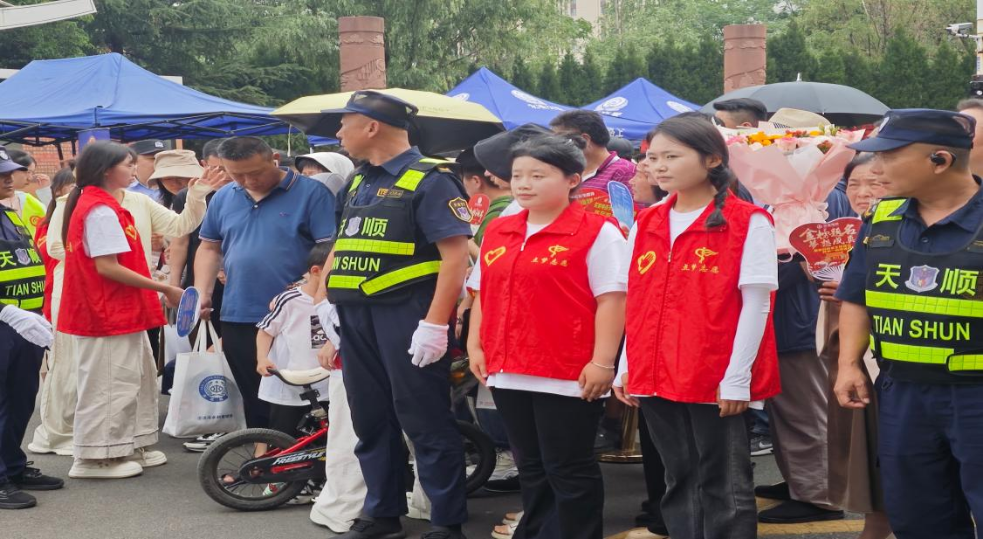 考场外,志愿者们携手同行,以青春之姿投身服务。他们通过路口“站岗”护秩序,搭棚备物送清凉,安抚家长送温暖,引导心理助减压等点滴行动,织就舒适安全护考网。