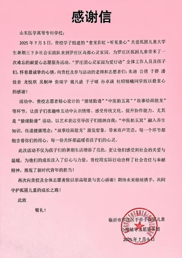 活动圆满结束后,罗庄区志愿服务组织专门发来感谢信,高度赞赏医专师生以实际行动关爱孤困儿童、传递社会温暖的善举,并期待未来能继续深化合作。未来,我校各级各类志愿服务组织将继续与社会各界携手同行,为服务社会贡献青春力量。